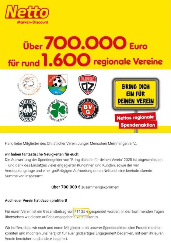 Ab sofort können Sie in der Penny-Filiale Dreikönigsmühle in Memmingen für den CVJM aufrunden oder den Pfandbon spenden. Die Aktion läuft bis zum 31.10.2026.